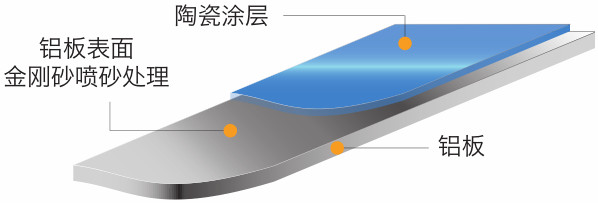 烤瓷鋁單板由鋁單板、噴砂表面處理層和一層無機涂膜層所組成,以高等級鋁合金為主要材料。烤瓷鋁單板表面涂層采用先進的陶瓷涂料系統,是專為鋁板外表面開發的無機涂料,陶瓷涂料系統擁有優秀耐久性能、抗化學腐蝕性能和良好硬度以及絕對優異的防火、絕緣性能。可以長久地經受日光曝曬、惡劣的天氣、酸雨、潮濕環境、汽車尾氣、工業污染物質等的侵害,尤其表現出容易清潔的特性。