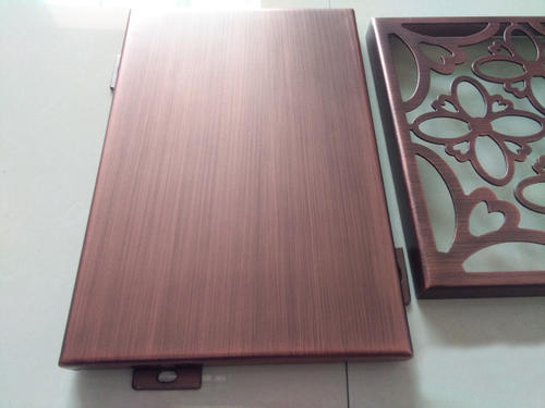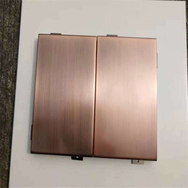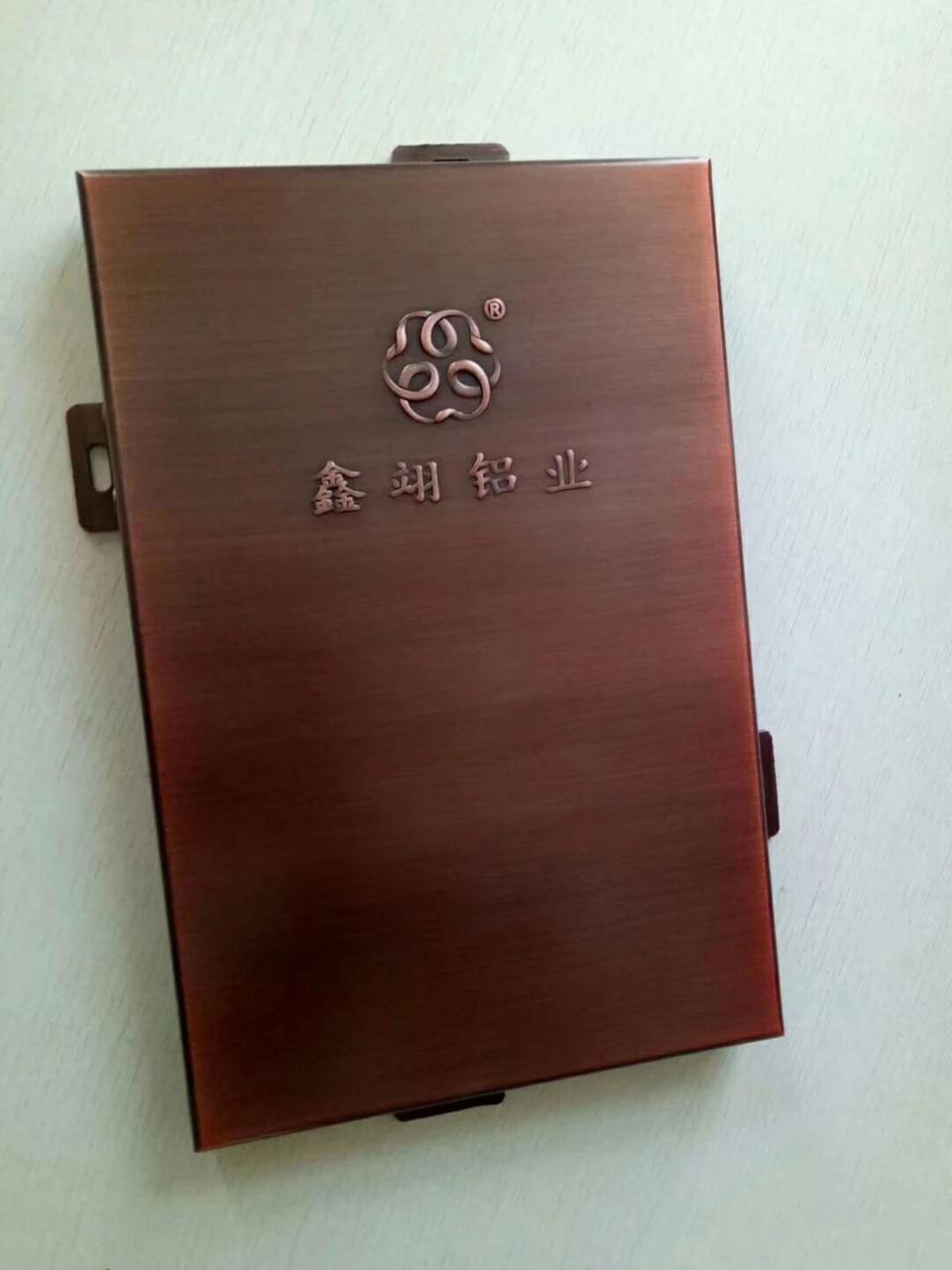 鍍銅拉絲鋁單板采用優質高強度合金鋁板,用“三涂二烤”工藝在鋁板上依次噴涂底漆、面漆、顏色漆及透明清漆,并在烘干固化后的仿銅氟碳漆表面進行拉絲工藝處理,氟碳漆仿銅產品圖案具有銅的實物感、立體感,效果逼真,紋理清晰,圖紋牢固耐磨。減少采用銅板裝飾的高額成本,節約資源,提高經濟效益。